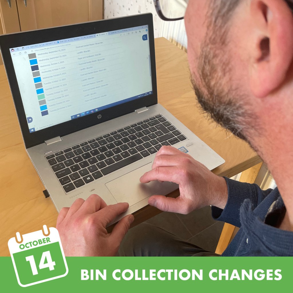 Blue bin – up to 2 bags of waste will be collected alongside the blue bin on the weeks 14 to 26 October.
