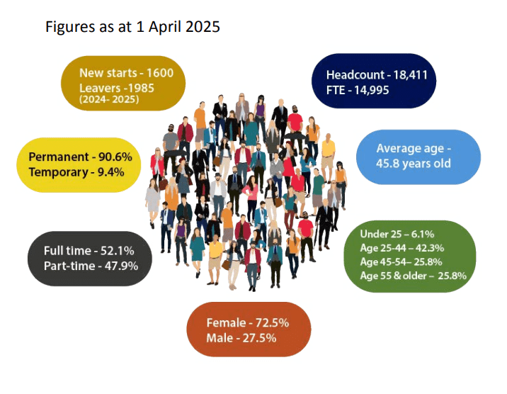 Figures shared during a recent Cabinet Committee also shed more light on the Council’s workforce, demonstrating that 1,985 people had left the Council in the previous year. The figures also showed 90% of the workforce are on permanent contracts, 72% were female and 52% worked full time. The average age of the workforce is 45.8 years old.
