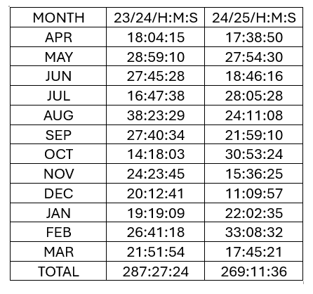 28hrs 29mins were spent enforcing traffic regulations at weekends during 23/24 and 23hrs 38mins in 24/25.