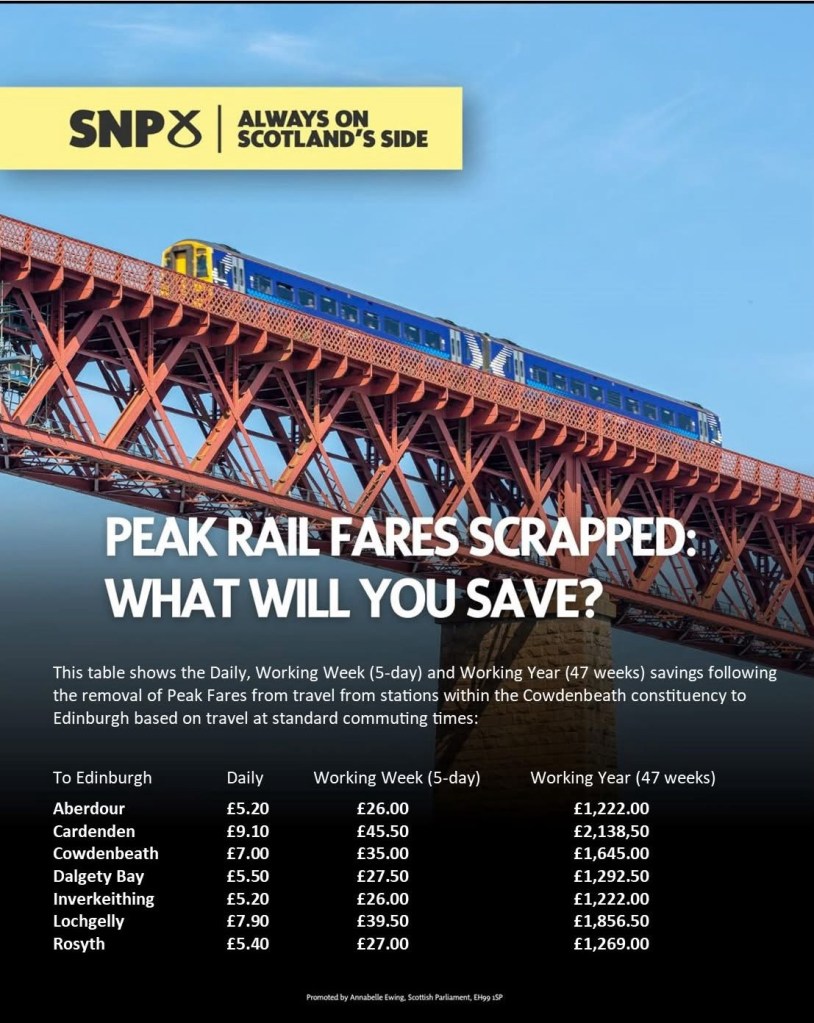 Cowdenbeath’s MSP Annabelle Ewing (SNP) welcomed the scrapping of peak fares as part of a range of measures to reduce the cost of living, saying on social media,