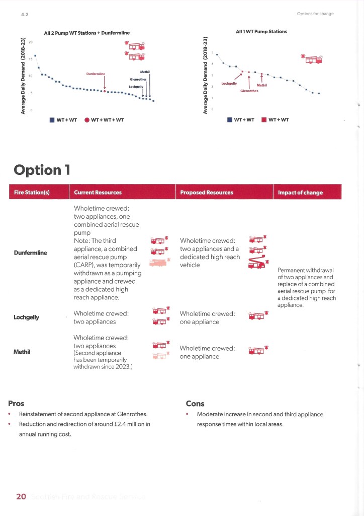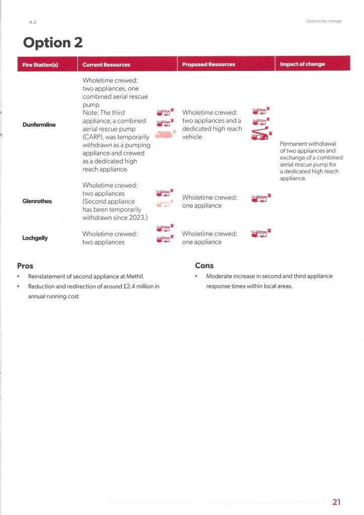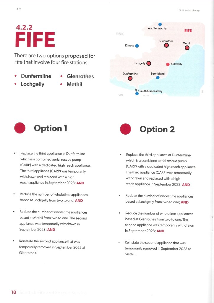 Plans are being consulted on two options which would both see the reduction of 25 firefighters and one appliance from Lochgelly, with the fire engine being repositioned to Methil or Glenrothes stations. A decision on the removal of Lochgelly’s specialist rope rescue unit, one of only 4 in Scotland, will be taken separately from this consultation.
