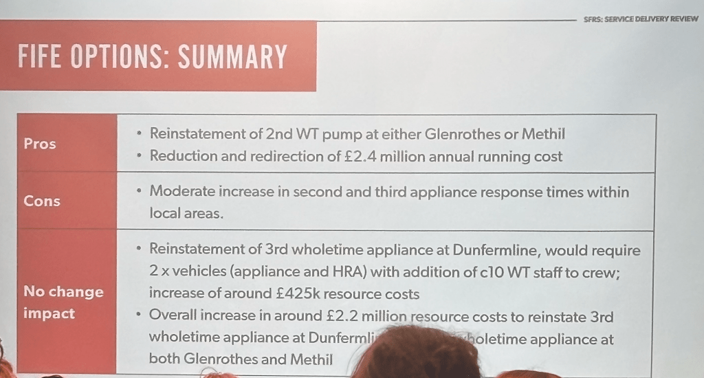 SFRS officials were at pains not to mention the F-word (Finances) during the 2-hour discussion, instead explaining why Lochgelly’s number of incidents and call-outs each year was more akin to a one-pump station, instead of the current two appliances (plus the specialist unit). Each pump has around 25 staff and this costs nearly £1.1m a year to maintain in a wholetime fire station.
