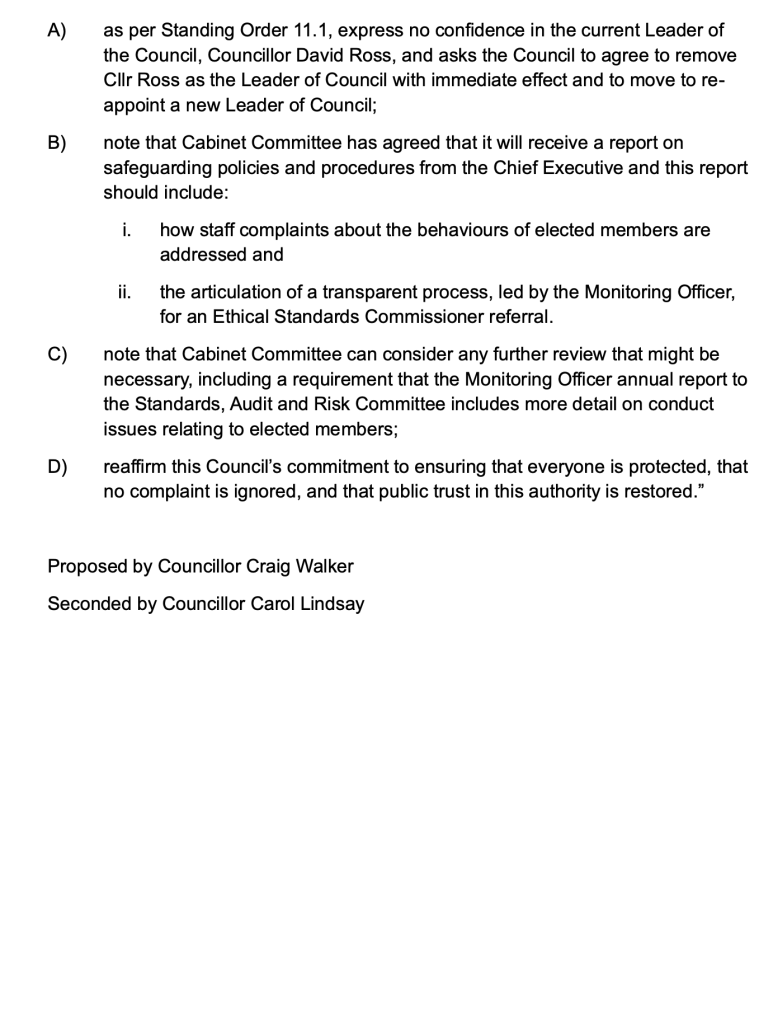 “Council therefore resolves to express no confidence in the current Leader of the Council, Cllr David Ross, and asks the council to agree to remove Cllr Ross as leader of the council with immediate effect and to move to reappoint a new leader.”