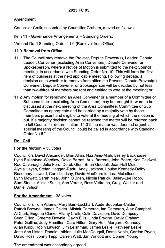 The Council’s procedures on the removal of the Leader were discussed in June 2023. A number of councillors had proposed to allow any removal of the senior council roles with a simple majority, which was ultimately voted down, and replaced with a requirement for a two-thirds majority of councillors instead. In a sick twist of irony the motion (as amended) was seconded by Cllr David Graham at the time. This means if the SNP’s motion fails, it will likely be due, in part, to rules supported by the now convicted sex offender!