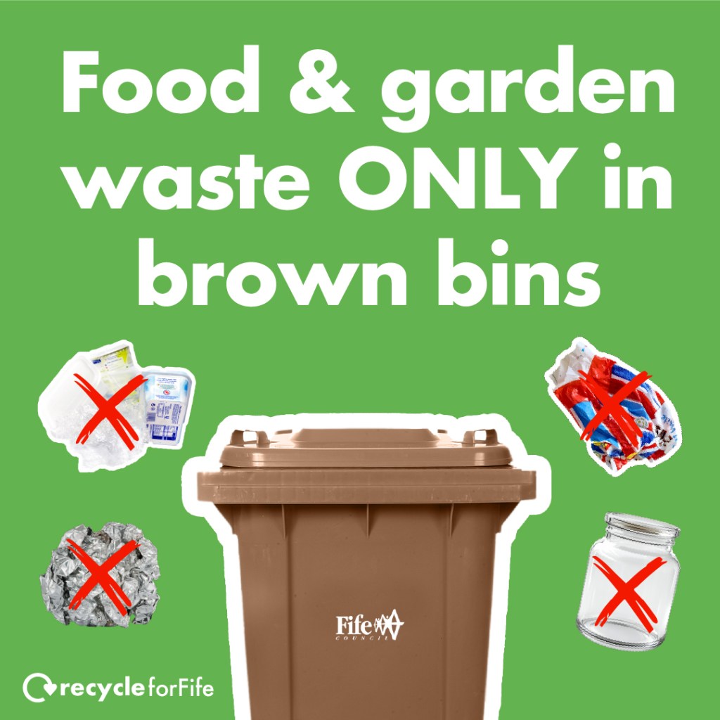 All cooked and uncooked food waste—from potato peelings and banana skins to bones, egg shells and coffee grounds—can be recycled. Fifers should only put food and green garden waste only in the brown bin. Items like glass, foil, plastic pots, plastic bags, or food still in packaging contaminate the process and stop the compost being used on farms. Although some of the wrong material is manually removed at the AD facility, contamination can lead to the compost being regarded as a waste rather than a resource, resulting in disposal costs, as farmers can’t use it.