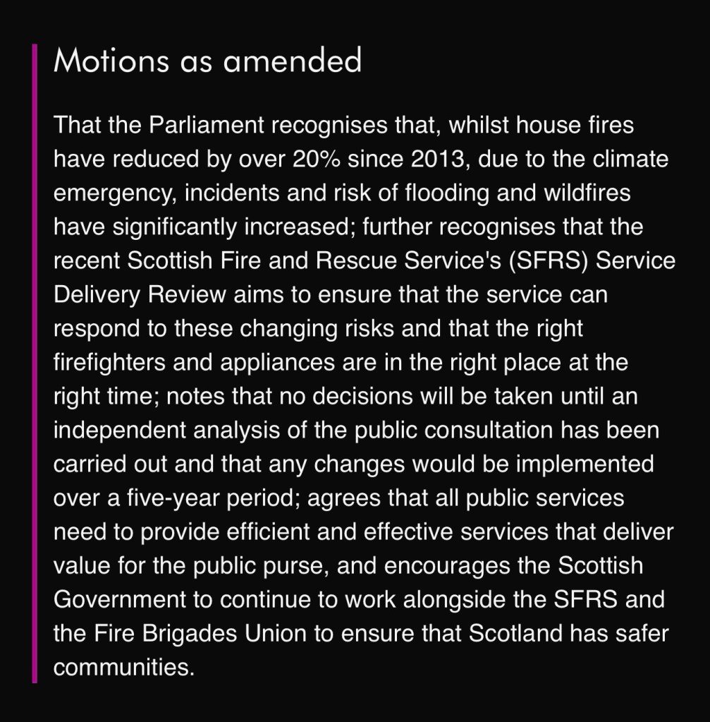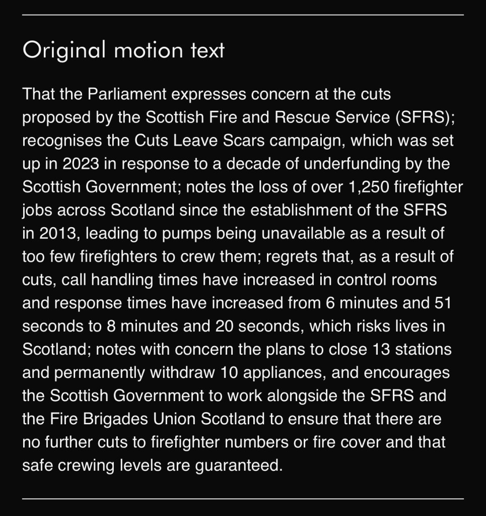 Katy Clark, Labour’s West of Scotland MSP had originally tabled a Motion for debate outlining the “concern at cuts proposed” by the fire service leadership and detailing the impact of budget cuts and the loss of over a thousand firefighters since 2013. Her full motion, which was then amended by the SNP, is below.