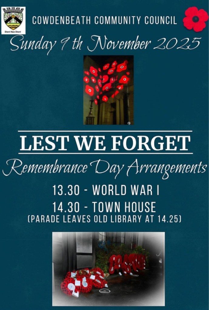 Cowdenbeath’s main services on Remembrance Sunday (9th Nov) will be held at 1.30pm at the WW1 memorial and 2.30pm at the Town House after a short parade from the former Library. Diversions will be in place due to the High Street being closed between Stenhouse St and Foulford Road during the Town House ceremony.